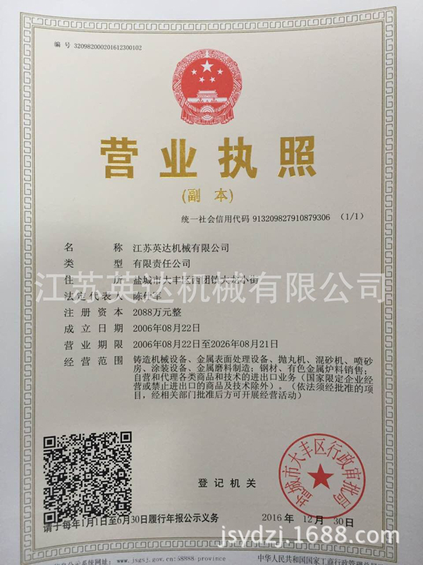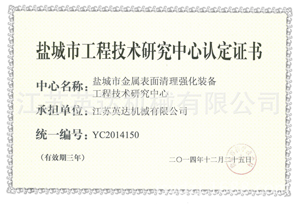 公司率先通過ISO9001:2008質(zhì)量管理體系認(rèn)證、ISO14001:2004環(huán)境管理體系認(rèn)證。擁有一支專業(yè)的技術(shù)團(tuán)隊(duì),先后取得了網(wǎng)帶通過式拋丸機(jī)、新型機(jī)械回收噴砂房、輥道通過式重鋼拋丸機(jī)等三十項(xiàng)產(chǎn)品專利和10項(xiàng)江蘇省高新技術(shù)產(chǎn)品。(注:各項(xiàng)產(chǎn)品專利及所有證書詳見企業(yè)官網(wǎng):http://www.ydzj.net/或阿里誠信檔案)